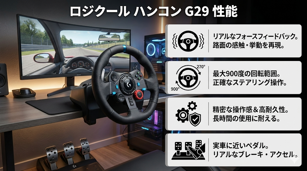 ロジクール G29が長年にわたり「ハンコンの代名詞」として君臨し続けるのには、明確な理由があります。単に「価格が手頃」というだけでなく、レーシングシミュレーターに必要な要素が高い次元でバランスよくパッケージングされているからです。ここでは、多くのユーザーに支持される具体的なメリットを深掘りして解説します。