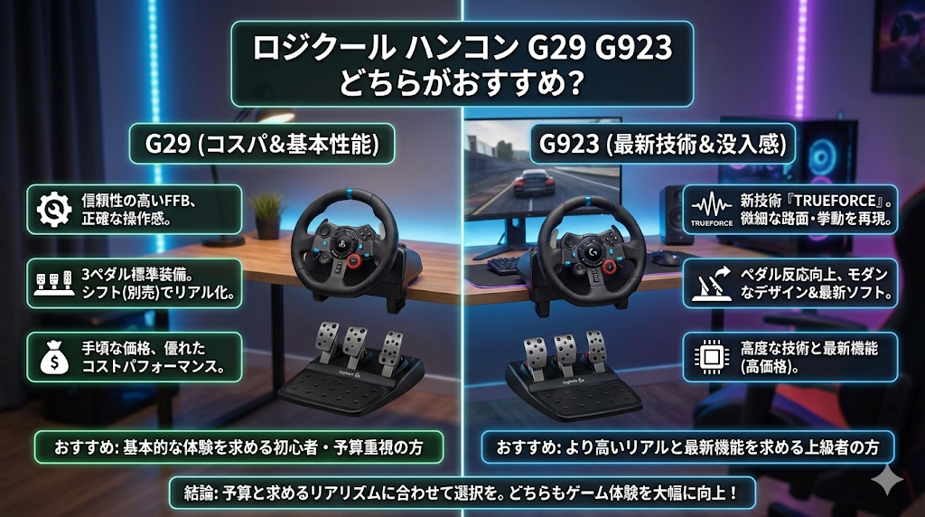 • G29はコストパフォーマンスに優れ、G923は最新技術と機能を求めるユーザーに適している