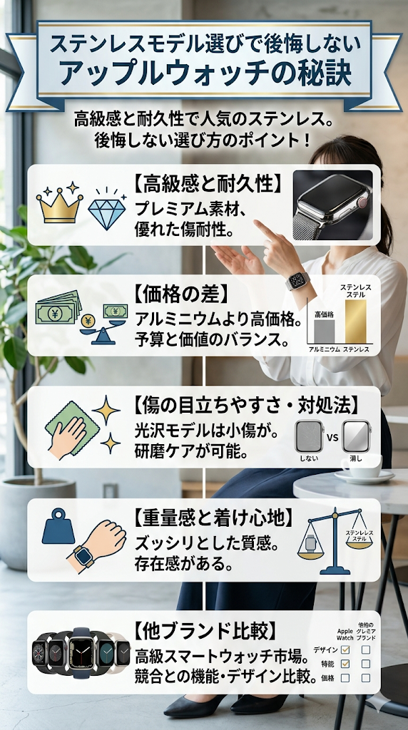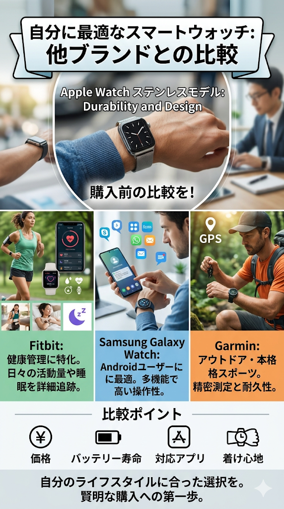 そのため、アップルウォッチのステンレスモデルの購入を考えている場合でも、自分の生活習慣や求める機能を再確認し、他ブランドとの比較を行うことが重要です。