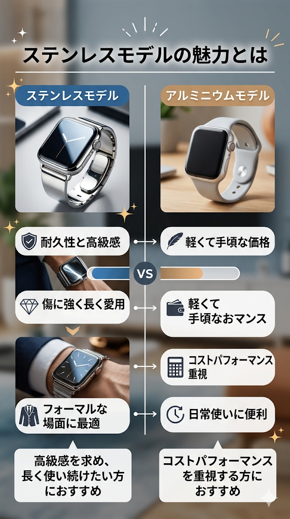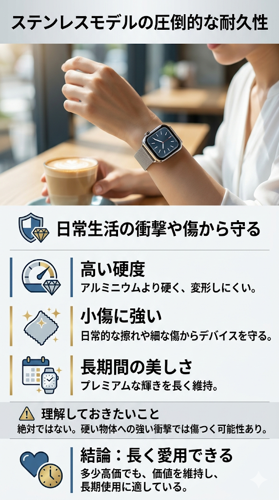 ステンレスモデルのアップルウォッチを選ぶ最大のメリットは、その耐久性と高級感です。