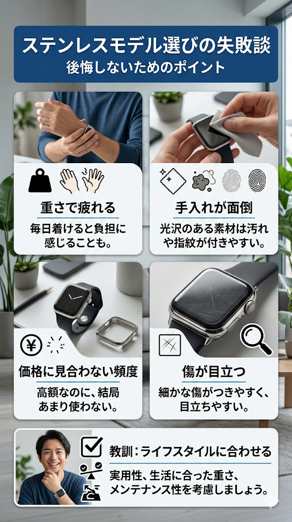 これらの失敗談は、ステンレスモデル選びにおいて、見た目や素材の特性だけでなく、実際の使用シーンやメンテナンスのしやすさ、自分のライフスタイルに合った重さかどうかも考慮することの重要性を教えてくれます。