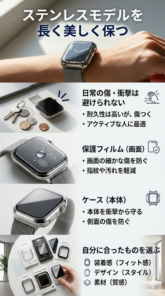 特に、アクティブなライフスタイルを送る方や、時計を着用しながら様々な活動を行う方は、ケースやフィルムでの保護が非常に有効です。