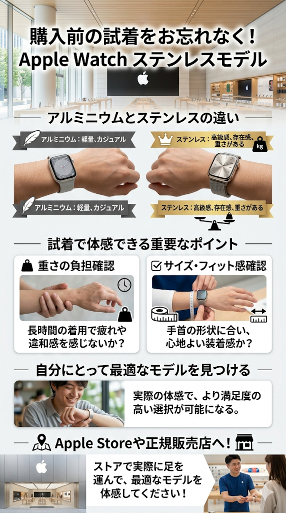 アップルウォッチ、特にステンレスモデルを選ぶ際には、購入前の試着が非常に大切です。