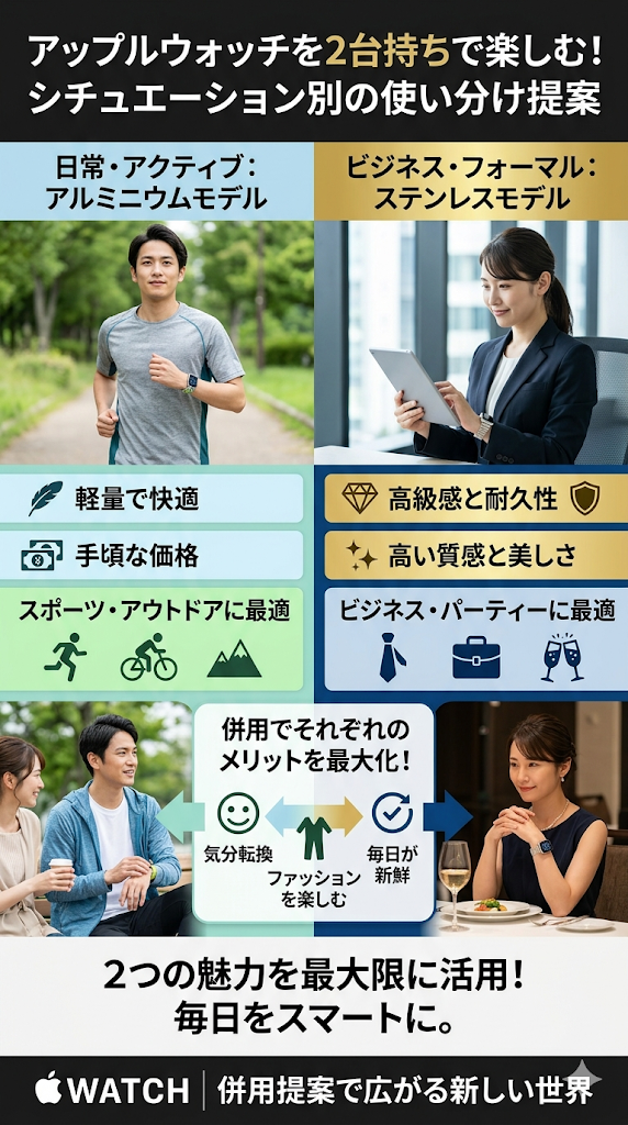 このように考えると、アルミニウムモデルとステンレスモデルの併用は、アップルウォッチをより有効に、そして楽しく使いこなすための選択肢と言えるでしょう。
