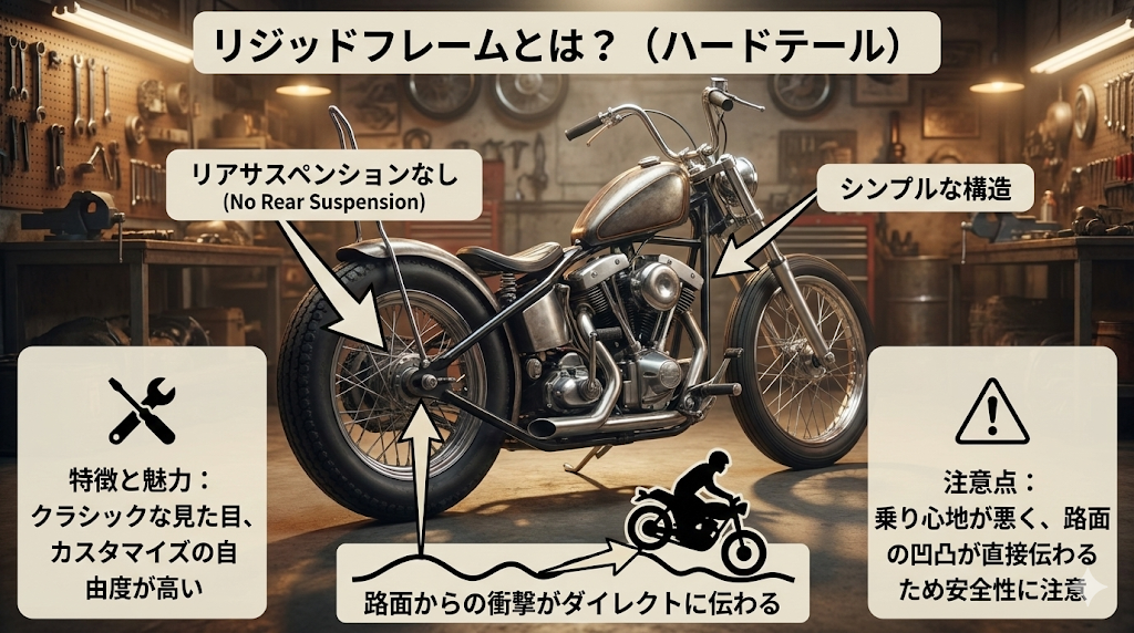 リジッドフレームとは、主にオートバイのフレームの一種で、リアサスペンションが存在しないため「ハードテール」とも呼ばれます。これは、フレームそのものが非常にシンプルで、後輪に直接つながっているため、道路からの衝撃がダイレクトにライダーに伝わる特性があります。そのため、一見すると乗り心地が悪そうに思えるかもしれませんが、シンプルな構造が多くのカスタム愛好者に支持されています。