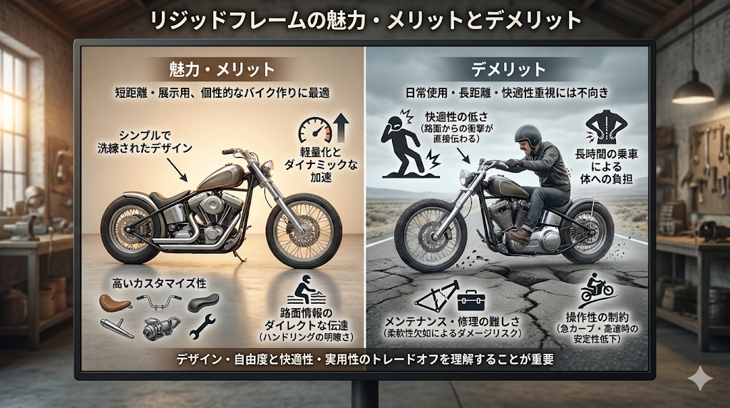 このように、リジッドフレームは見た目の美しさだけでなく、カスタマイズの自由度とハンドリングの明瞭さをバイクエンスージアストに提供するため、多くのライダーに愛されています。