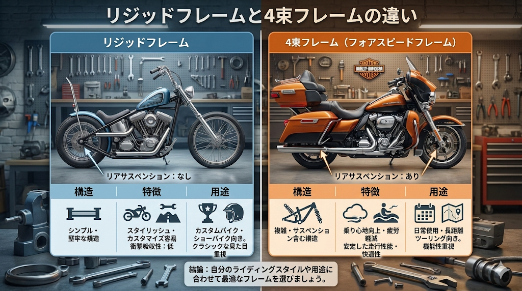 このため、リジッドフレームは主にカスタムバイクやショーバイクに適しており、クラシックな見た目を重視するライダーに選ばれがちです。対照的に、4束フレームは日常の使用や長距離ツーリングに適しており、機能性を重視するライダーから支持されています。