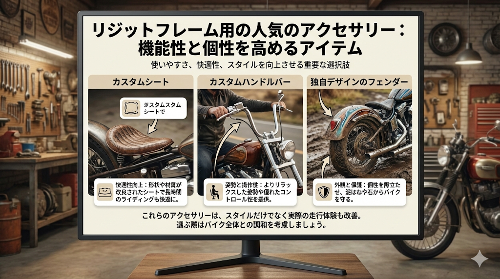 リジットフレーム用のアクセサリーは、バイクの機能性を高めると同時に、見た目を個性的に演出するために非常に重要です。これらのアクセサリーは、使いやすさや快適性を向上させることができるため、多くのライダーに選ばれています。