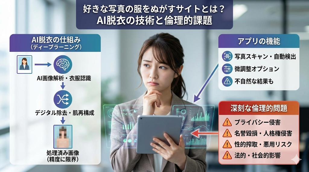 AI技術の進化に伴い、写真から衣服を取り除く「好きな写真の服をぬがす サイト」が注目を集めています。この技術は、ディープラーニングとコンピュータビジョンを駆使して、画像内の衣服をデジタル的に削除する仕組みです。