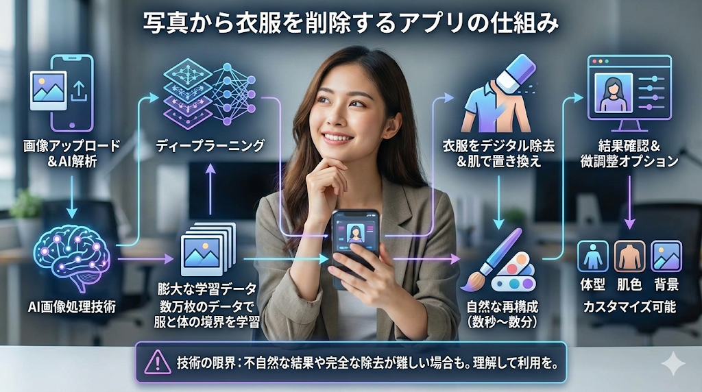 このプロセスは、ディープラーニングと呼ばれる技術を使用して行われ、膨大なデータセットに基づいた学習によって精度が向上しています。AIは、これまでに学習した数万枚以上の画像データを参考にして、どの部分が服でどの部分が体であるかを判断します。解析が完了すると、AIは衣服の部分を「消去」し、その領域を肌や体に置き換える処理を行います。この処理は、画像の解像度や服のデザインによって処理時間が異なりますが、多くのアプリでは数秒から数分で完了します。