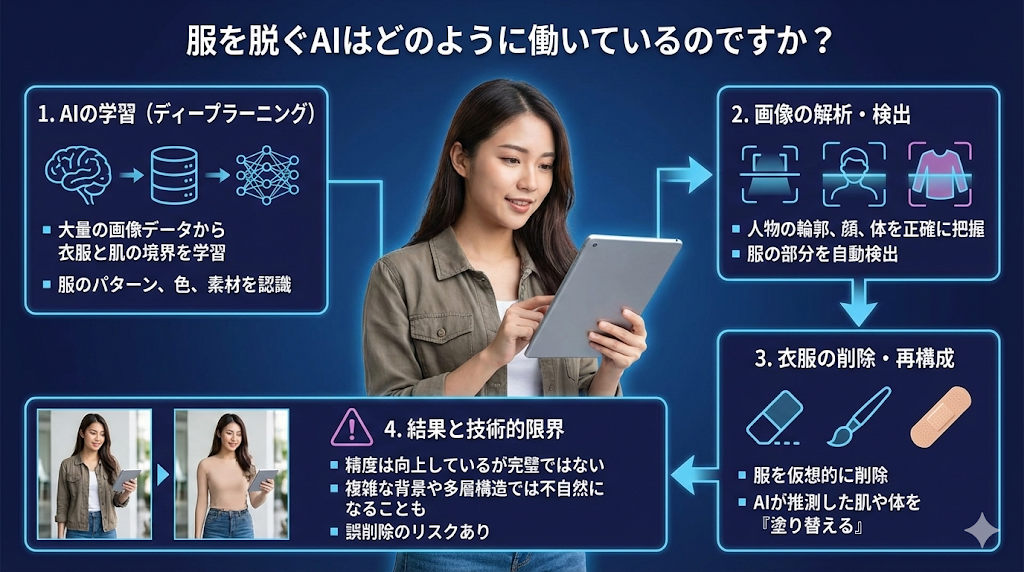 AI脱衣の技術は、ディープラーニングやコンピュータビジョンを駆使して画像を解析し、衣服と肌の境界を認識します。これにより、AIは画像内の人物をデジタル的に処理し、まるで服がなかったかのように画像を修正します。ただし、精度には限界があり、特に複雑な衣装や背景がある場合には結果が不自然になることもあります。