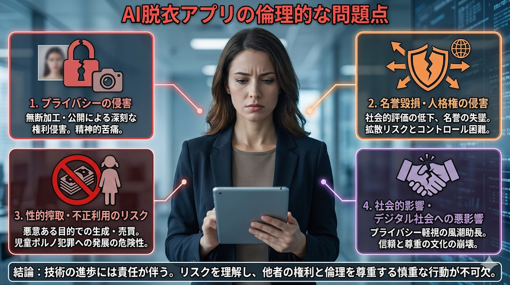 結論として、AI脱衣アプリの技術は技術的な進歩である一方、その使用には大きな倫理的課題が伴います。プライバシーの侵害や名誉毀損、性的搾取などの問題が発生する可能性があるため、こうした技術の利用には慎重な態度と責任ある行動が求められます。技術の利便性を享受するためには、そのリスクを理解し、他者の権利や社会的な倫理を尊重することが不可欠です。