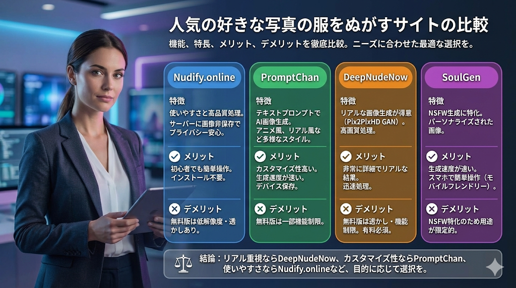 その他のAI脱衣アプリとしては、NudifyMe、ClothesOff AI、Undress AIなどが挙げられます。NudifyMeは、シンプルなインターフェースと迅速な結果提供が特徴で、特に初心者に適しています。ClothesOff AIは、リアルな画像生成と細かなカスタマイズが可能で、ユーザーの要求に応じた高精度な結果を提供します。Undress AIは、無料で使用できることが大きなメリットで、予算に制限があるユーザーに最適な選択肢となります。