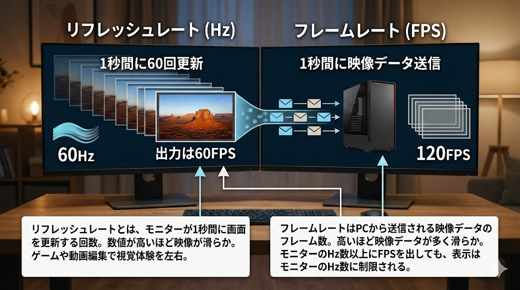 リフレッシュレートとフレームレートは似ていますが、モニターが対応するリフレッシュレート以上のフレームレートを出力しても、映像はモニターのリフレッシュレートに制限されます。