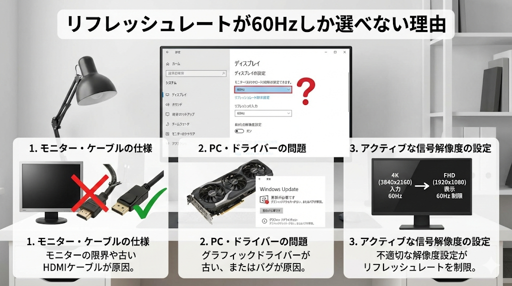 リフレッシュレートが60Hzしか選択できない場合、いくつかの要因が考えられます。