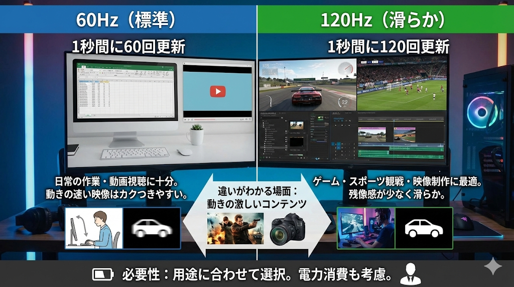 60Hzは、1秒間に60回画面を更新するため、通常の作業や動画視聴には十分ですが、動きの速いゲームや高品質な映像制作では120Hz以上が好まれます。