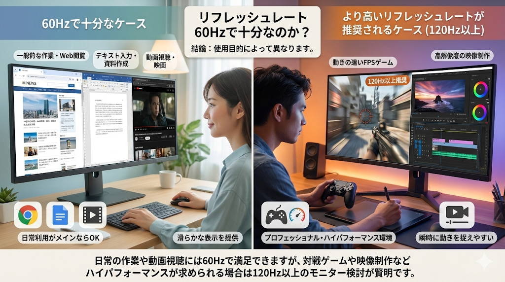 リフレッシュレートが60Hzで十分かどうかは、使用目的によって異なります。