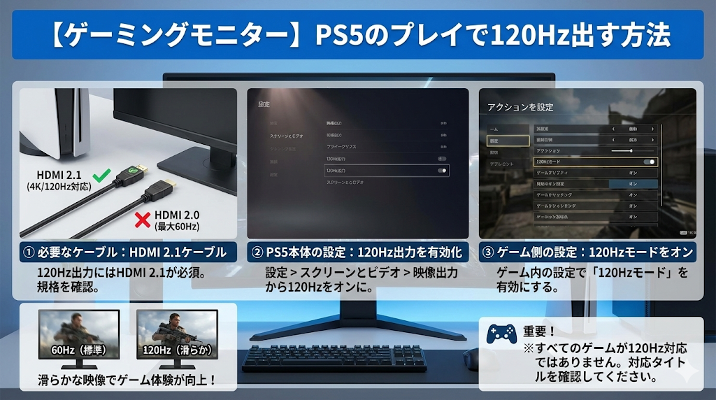 PS5の120Hz対応を最大限に活用するには、接続環境やゲームの設定を見直し、さらに120Hz対応のモニターを使うことで、滑らかな映像でのゲーム体験を楽しめます。
