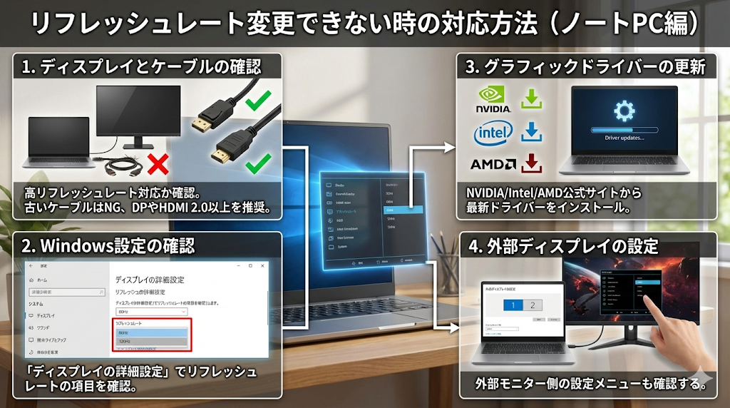 ノートPCでリフレッシュレートの変更ができない場合、まず確認すべきはPCのディスプレイと接続ケーブル、グラフィックドライバーの状態です。