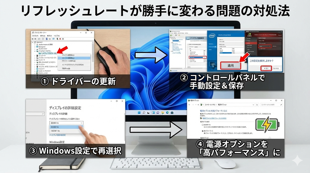 Windowsでは、特定の設定やドライバー更新後に、リフレッシュレートがデフォルトの60Hzに戻る現象が発生することがあります。この場合、設定を固定するいくつかの対処法が有効です。