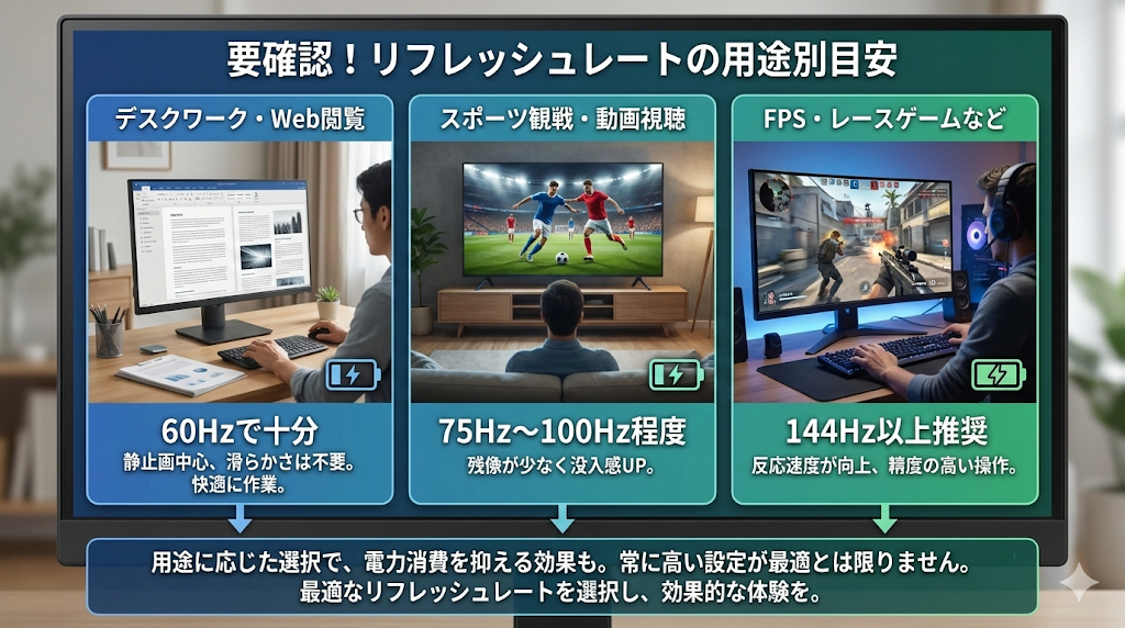 用途に応じてリフレッシュレートを選ぶことは、電力消費を抑える効果もあります。