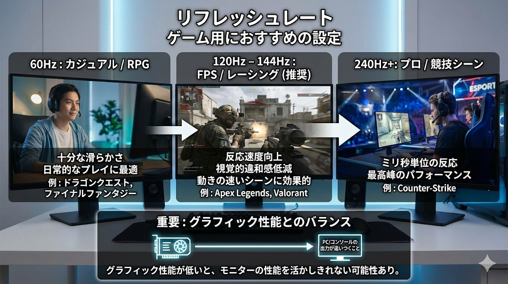 ゲームプレイに適したリフレッシュレート設定は、使用するゲームの種類とプレイヤーの求める滑らかさによって異なります。