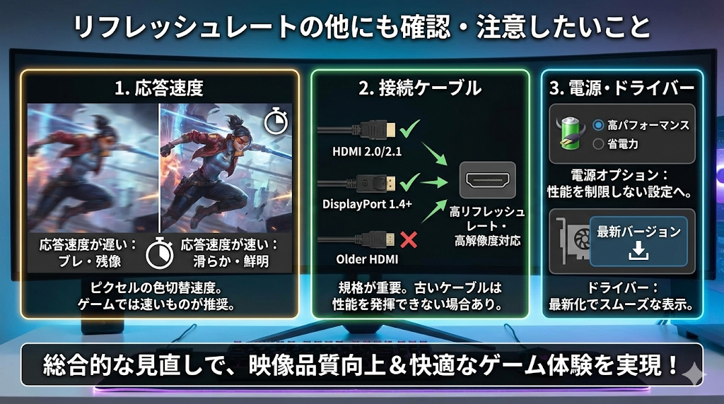 こうした要素を総合的に見直すことで、リフレッシュレートの設定だけでなく、全体的な映像表示の品質を向上させ、快適なゲーム体験を実現できるでしょう。