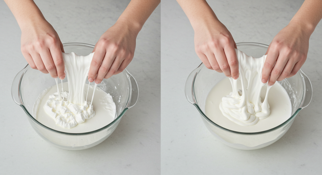 - 感触で判断する: 粉っぽさがなくなり、混ぜる際に力を加えるとキュッと固くなる感触になったら、ほぼ完成です。目安としては、少しつまんだ時に、指から離すとボウルの中に自然と戻っていくくらいの硬さがちょうど良いでしょう。まるでスライムのようですが、それよりももっと弾力がある感じとでも言いましょうか。