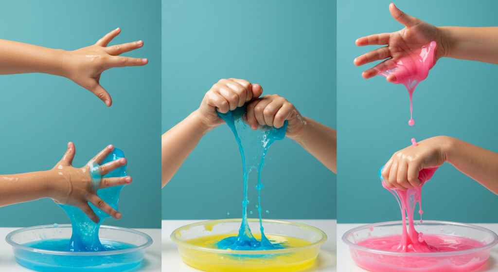 - 固まる瞬間を体験: 手のひらにダイラタンシー流体を乗せて、お団子を作るように丸めてみましょう。グッと握っている間はカチカチに固まりますが、手のひらに置いて力を抜くと、ドロ~ッと液体のようになります。この変化は本当に面白いですよ。