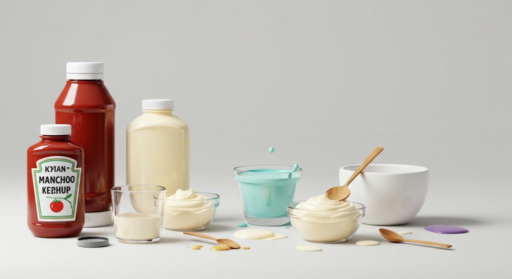 - 食品加工・日用品: ケチャップやマヨネーズが使いやすいように設計されているのも、非ニュートン流体の特性を利用した例です。また、ペンキや塗料も、塗るときはスムーズに流れ、塗った後は液だれしにくいように、その粘度がコントロールされています。印刷インキや歯磨き粉、化粧品のクリームなども、同様にその特性が製品の品質や使い心地に直結しています。