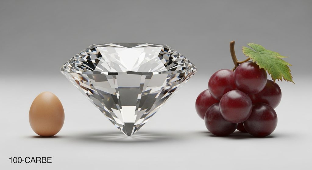 100カラットのダイヤモンドは、重量にして約20グラムになります。このサイズを日常の物体に例えると、「小さな卵」や「大きなブドウ」に匹敵するほどのサイズ感を持っています。なぜこのように重くなるのかといえば、ダイヤモンドの重さの単位である1カラットは0.2グラムと厳密に定められているからです。単純計算で100カラットは20グラムになります。