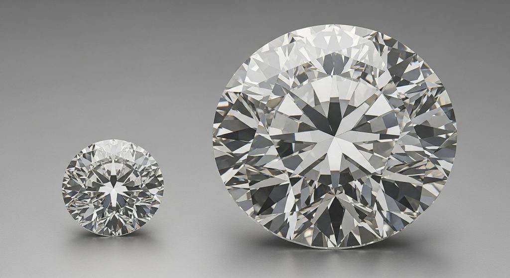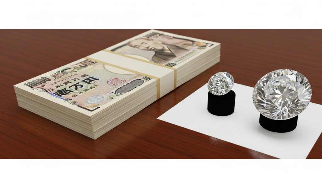 現在の市場価格と為替レート(1ドルあたり約153~154円)に基づくと、100万円の予算で購入できるのは、天然ダイヤモンドの場合、おおよそ1カラット前後のサイズになります。ダイヤモンドの品質、特にカラーやクラリティをある程度犠牲にすれば、100万円で1カラットの天然ダイヤモンドを手に入れることは可能です。しかし、多くの場合、この予算では天然ダイヤモンドの中でもエントリーレベルの品質(例:H~Iカラー、VS2~SI1クラリティなど)に落ち着くでしょう。より高い品質を求めるなら、カラット数を下げる必要があります。品質基準を緩めることで、目標のカラット数に近づけるわけです。