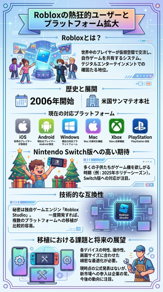 これだけ幅広い環境で遊べるとなれば、ロブロックス switch版の登場を期待する声が高まるのは自然な流れと言えます。例えば、2025年の年末商戦において、多くの子供たちがクリスマスプレゼントとしてゲーム機を希望した際、そこに人気プラットフォームが含まれているかどうかは大きな関心事でした。さて、実際に多様なデバイスで展開されている背景には、独自のゲームエンジンであるRoblox Studioの存在があります。このツールは、開発者が一度ゲームを作成すれば、様々な環境へ比較的容易に移植できる仕組みを提供しています。