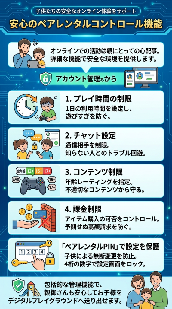 保護者の方にとって、子供がオンラインの世界でどのように遊んでいるかは常に心配の種となります。そこで活用したいのが、詳細に設定できるペアレンタルコントロール機能です。この機能を使えば、子供が安全な環境で楽しめるように、保護者のスマートフォンやパソコンからアカウントの制限を管理することができます。