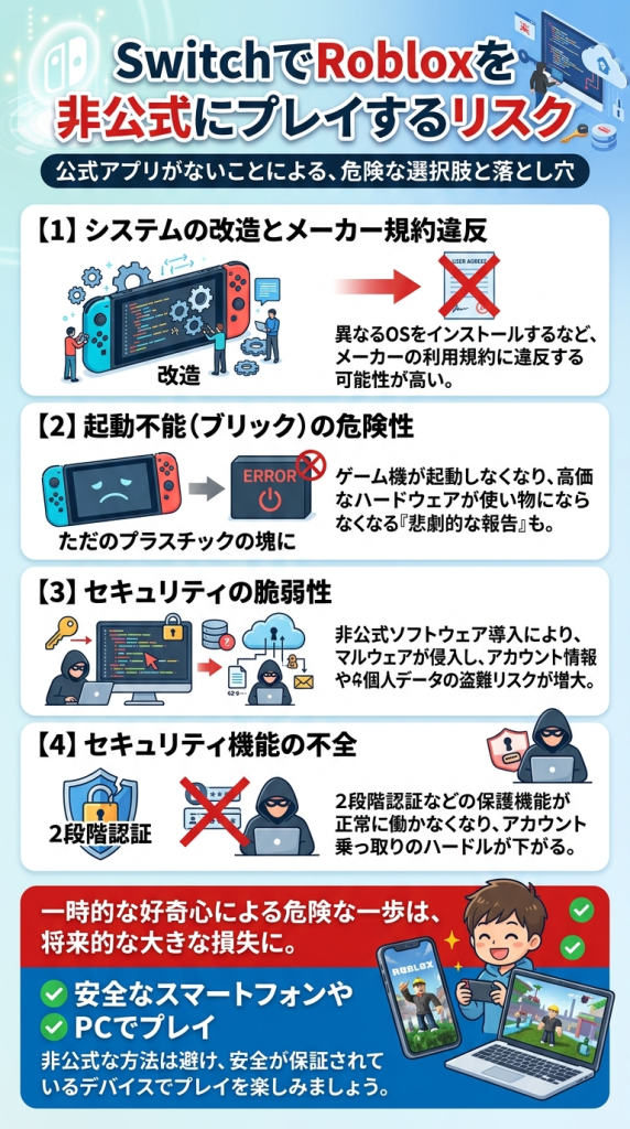 公式なアプリが提供されていない状況下において、インターネット上にはロブロックス switch版を非公式な方法でプレイする手順を紹介する情報が散見されます。しかし、これらの情報に飛びつく前に、そこに潜む重大なリスクについて十分に理解しておく必要があります。システムを改造して別のオペレーティングシステムを導入するといった行為は、デバイスのメーカーが定めた利用規約に違反する可能性が極めて高いです。