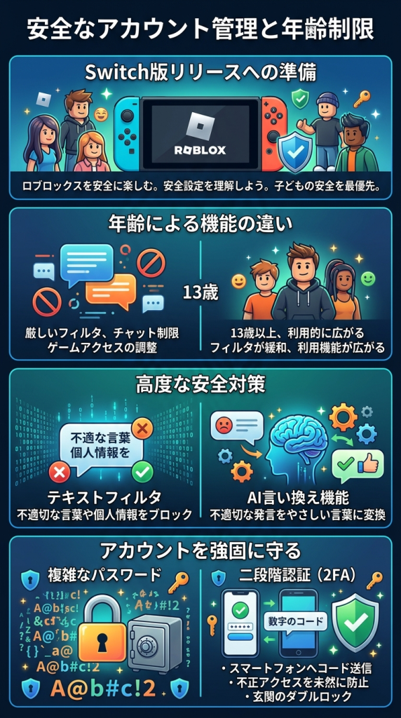 将来的にロブロックス switch版がリリースされた際、スムーズにプレイを始めるためには、今からアカウントの仕組みや安全設定について理解を深めておくことが大切です。このプラットフォームは、すべての年齢層が楽しめる空間を目指しており、特に子供たちの安全を守るための厳格なシステムが導入されています。例えば、アカウントを作成する際に入力する生年月日は、利用できる機能を決定する重要な要素となります。