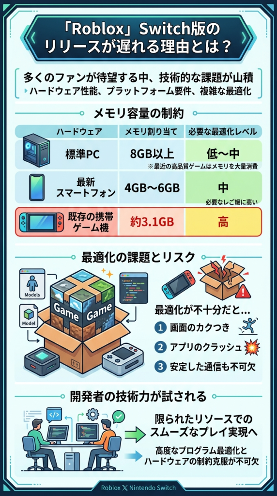 多くのファンが首を長くして待っている状態ですが、なぜロブロックス switch版のリリースがこれほどまでに時間を要しているのでしょうか。その背景には、ハードウェアの性能とプラットフォームのシステム要件という、複雑に絡み合った技術的な課題が存在しているという情報があります。前述の通り、多様なデバイスに対応してきた歴史があるものの、任天堂の携帯型ゲーム機は独自の設計思想に基づいています。