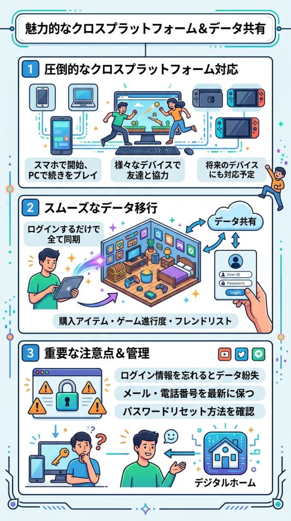 データの引き継ぎも非常に簡単です。新しくデバイスを購入した場合でも、既存のアカウントのユーザー名とパスワードを入力してログインするだけで、購入したアイテムやゲームの進行状況、フレンドリストなどがすべてそのまま引き継がれます。まるで、自分の部屋の環境をそのまま別の場所に持ち運べるような、魔法のような体験と言えるかもしれません。